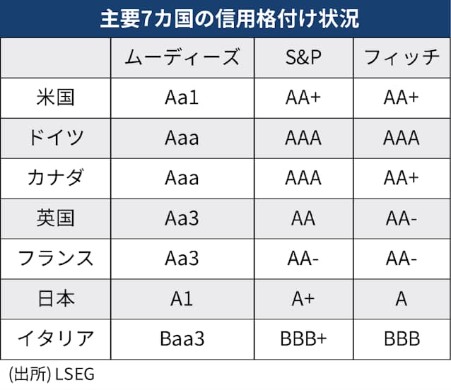 米国に最上位の格付けを付与する主要格付け会社はなくなった。S&Pグローバル・レーティングは11年8月に、フィッチ・レーティングスは23年8月に米国の格付けを最上位のトリプルAからダブルAプラスに1段階引き下げている。