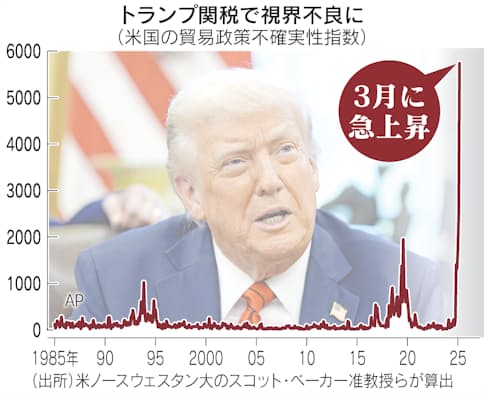 米ノースウェスタン大のスコット・ベーカー准教授らが新聞記事などから算出する米国の「貿易政策不確実性指数」は3月、5735に跳ね上がった。大統領選直前だった2024年10月の29倍、第1次政権で過去最高を更新した19年8月の3倍だ。トランプ政権の猫の目の関税政策が経済の先行きを極めて不透明にしていることを映す。
