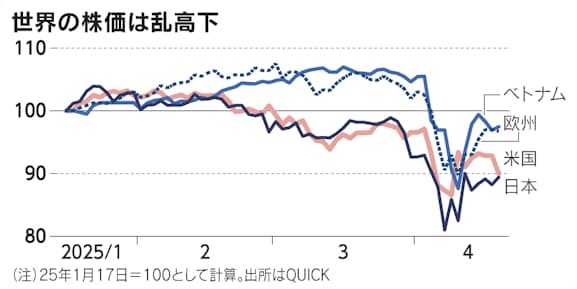 世界の株価は乱高下している。米国のダウ工業株30種平均は4月に24年末比で一時13%安となった。欧州主要600社の株価指数であるストックス600は同11%上昇した後、4月に同7%の下落に転じた。46%と高い相互関税を課されたベトナムの株価指数は下げ幅が一時14%に達した。