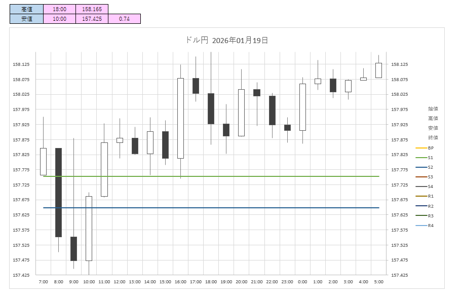 19日の海外市場でドル円は、ニューヨーク市場がキング牧師の誕生日で休場となったため、158.00円を挟んだ狭いレンジでのもみ合いに終始した。ユーロドルは、米国市場が休場で取引参加者が少ない中、1.1649ドルまでじり高に推移した。ユーロ円は、ユーロドルの上昇に連れて184.17円まで上昇した。