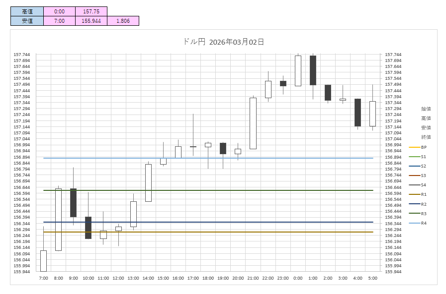 ただ、2月9日の高値157.76円や心理的節目の158.00円がレジスタンスとして意識されると上昇は一服した。