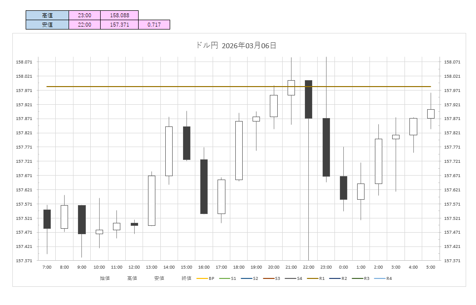 米労働省が発表した2月米雇用統計では非農業部門雇用者数が9.2万人減と予想の5.5万人増に反して減少し、失業率が4.4%と予想の4.3%より弱い内容となった。結果が伝わると一時157.41円付近まで下押ししたものの、下値は限定的だった。アジア時間に付けた日通し安値157.39円が目先サポートとして意識された面もあった。中東情勢の緊迫化を背景に原油高・ドル高の流れも継続し、23時30分前には再び158.09円まで上げた。