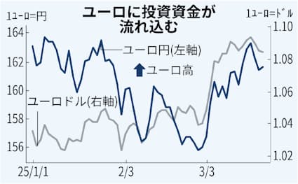 ユーロに投資マネーが流れ込んでいる。2月以降、ドルからの資金移動が始まり、3月には円からの資金流入も強まった。利上げ路線の日銀、いったん利下げを止めた米連邦準備理事会(FRB)に対し、欧州中央銀行(ECB)は3月も利下げを続けており、金利差要因はユーロ売り材料のように映る。ユーロの意外な上昇は、市場の円高シナリオにも修正を迫っている。