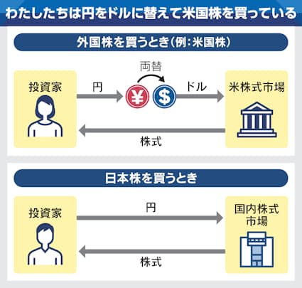 米国の株式市場で株式を買うには、ドルで支払う必要があります。海外旅行でニューヨークに行けば、お店で買い物をするのにドルが必要なのと同じです。また、日本で暮らして円で収入を得ている人は、自分の買った米国株の評価額を円に換算していくらか、で見るでしょう。このように、円をドルに替えたり、その評価額を円で見たりするときには、為替の影響を受けます。