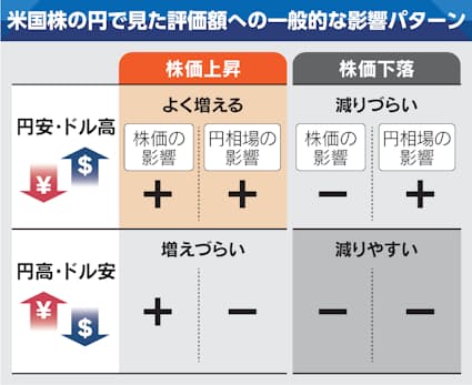 米国株の株価が上昇しているとき、円安・ドル高が進めば株高と円安のダブル効果で円で見た評価額が上がる一方、円高・ドル安に振れれば株高の好影響を円高が弱めるかたちで円で見た評価額は増えづらくなります。この考え方の裏返しで米国株が値下がりしているときは、円安・ドル高が進めば円で見た評価額は減りづらく、円高・ドル安に振れればダブル効果で円で見た評価額が下がります。