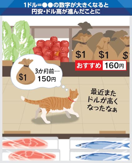 例えばお店で魚や野菜と同じ売り物のように「1ドル」が並んでいる様子をイメージしてください。3カ月前には150円で買えていた1ドルが、今日は値札を見ると160円になっていたとします。あなたは「ドルが高くなったなぁ」と感じるのではないでしょうか。