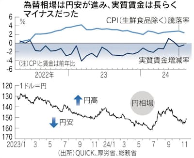 輸出産業に追い風とされる円安だが、恩恵は薄れている。10年度時点で平均1ドル=85円台だったドル円相場は23年度に同144円台まで円安が進んだ。その間の海外直接投資は4倍に膨らむ一方、国内の設備投資は5割増にとどまった。むしろ消費を冷やすマイナス面の影響が色濃くなり、日銀公表の実質消費活動指数(訪日客消費の影響除く)は今年9月にかけて10カ月連続で前年同月比マイナスだ。