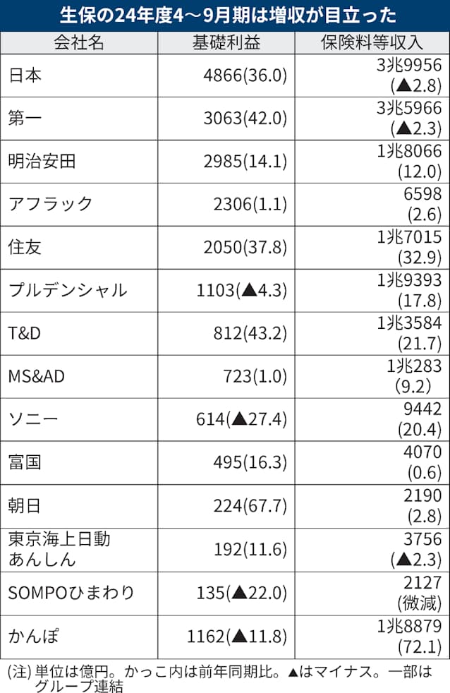 主な生命保険会社の2024年4〜9月期決算が25日、出そろった。本業のもうけを示す基礎利益は14社・グループの合計で前年同期比18%増の2兆730億円だった。円安で外貨建て資産の利息や配当金が膨らんだ。堅調な決算だったが、トランプ次期米大統領の就任など市場を取り巻く不透明な環境を踏まえて先行きには慎重なコメントが目立った。