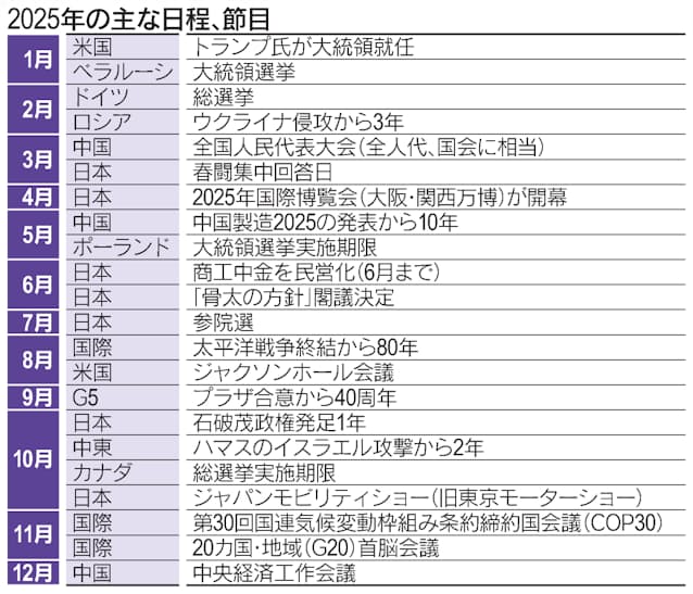 2025年の最重要イベントは年初に訪れる。トランプ氏の米大統領就任だ。トランプ氏はかねて1月20日の就任初日に不法移民の取り締まり強化と石油・ガスの採掘拡大、中国やメキシコ、カナダへの関税引き上げを実行に移すと主張してきた。