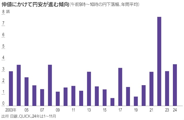 東京外為市場では、仲値が公示される午前9時55分に向けて円安・ドル高が進むアノマリーが広く知られる。2003年から現在までのデータを算出すると、午前9時から午前10時にかけて平均で2.3銭の円安・ドル高が進んでいた。1.2銭円高・ドル安が進んでいた10時〜11時の値動きとは対照的だ。24年(9〜10時)の円の下落幅は同3.6銭と、最も傾向が強かった22年(同7.8銭)に次ぐ大きさだ。
