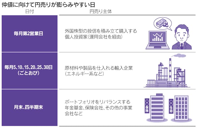 資金決済が集中しやすい毎月5、10、15、20、25、30日(「5・10日」=ごとおび)に円安進行の傾向は強まる。日本ではごとおびに支払いをまとめる商習慣「五十払い(ごとばらい)」が輸入勢の間で根強く残る。金曜日や月末が重なったごとおびは特に注文が増えるという。