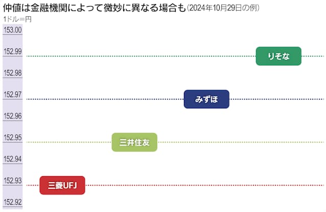 金融機関が外国為替取引をする際に基準とする為替レートが仲値だ。金融機関は顧客を相手に外貨を売買する際、仲値に受け取る手数料を上乗せした上でレートを決める。海外旅行前に円を外貨に換えるとき、売りと買いのレートの中心になるのが仲値だ。