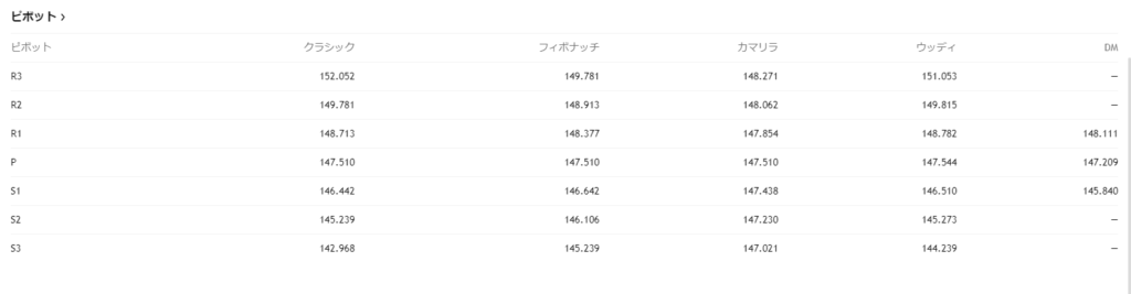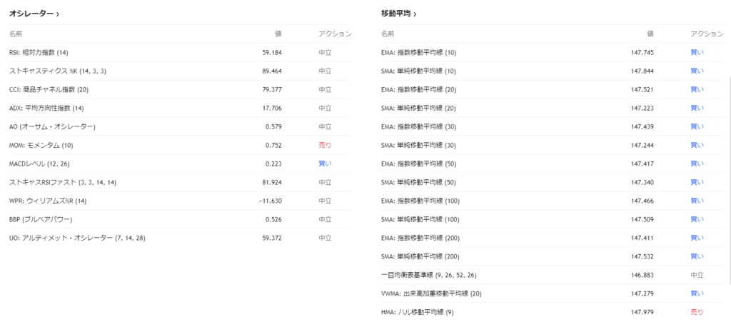 - 移動平均:SMA100が147.5付近を走っており、中立的。