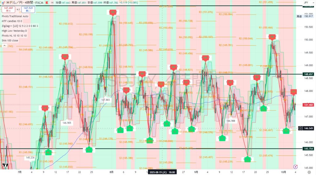 - 価格帯:147.4円付近(4時間足では下値147.0、上値148.6が意識)