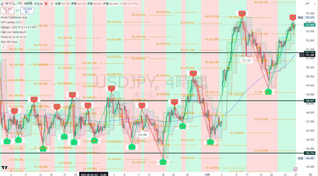 → 152.8円付近から勢い良く上抜けし、153.2~153.7円付近をターゲット。さらに上抜けなら 155円を視野に入り得る。 - シナリオ B(レンジ・調整)