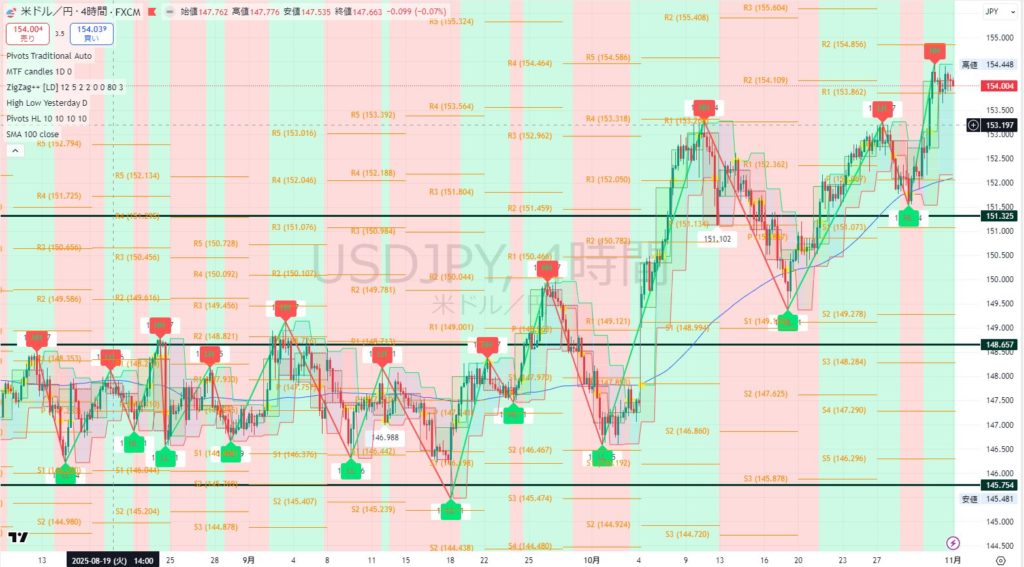 • 利益確定・レンジ想定なら:154円近辺で部分的に利確し、残りをレンジ内の上下で回転狙い。