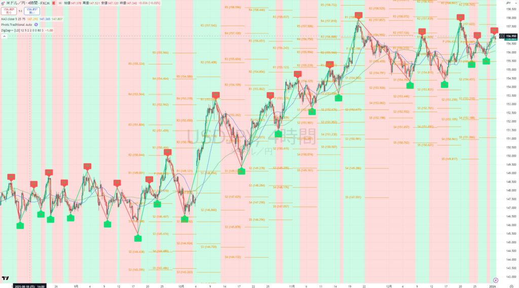 - 156.80〜157.20 を上抜けすると加速しやすい