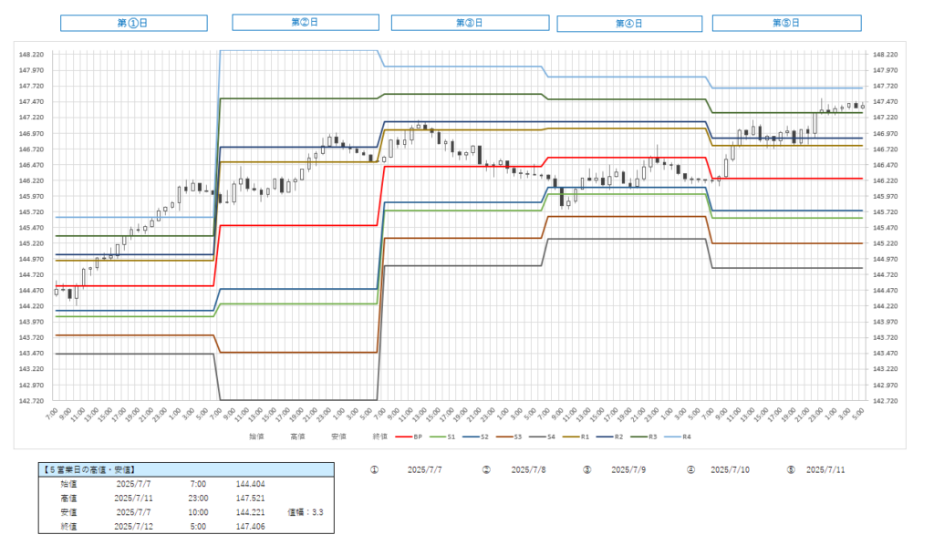 ・ドル円は堅調。トランプ米大統領が自身のSNSでカナダに対しての35%の関税を課すという、カーニー加首相宛の書簡を公表。対カナダドル主導でドル買いが優勢になるとドル円は強含んだ。本邦実需勢からの断続的な買いも観測されると一時147.18円まで買い上げられた。