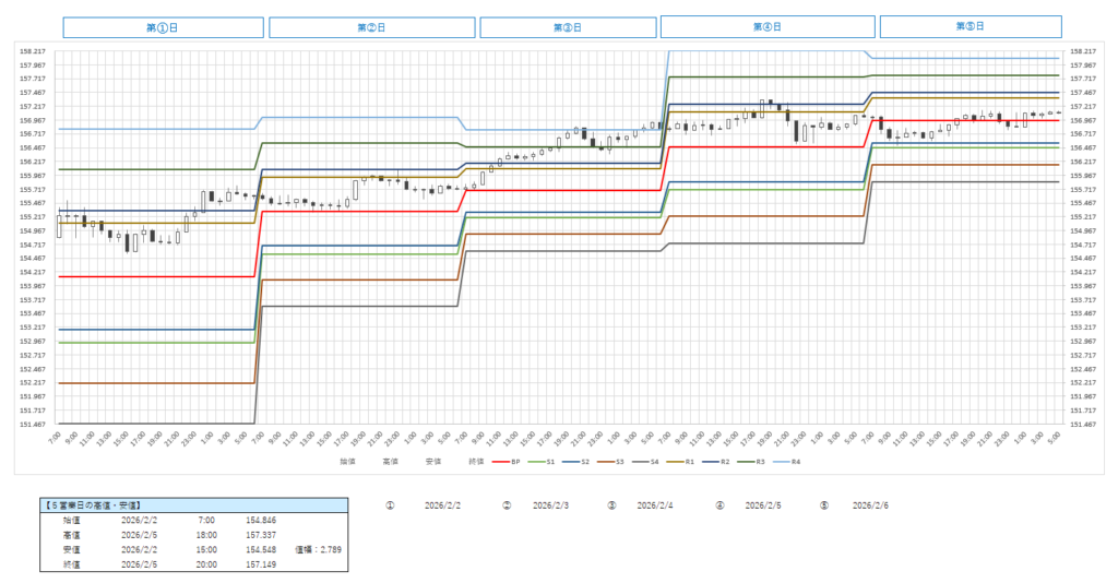 • ドル円 (USD/JPY): 週初は154円台後半で推移していましたが、1月ISM製造業景況指数の好結果を受けてドル買いが加速。1月23日の高値であり、強力な抵抗帯として意識されていた157.34円まで上昇しました。週後半、雇用指標(ADP/JOLTS)の弱含みを受けて一時156.54円まで押し戻される局面もありましたが、週末にかけてキャリートレードの需要が再燃。157.22円〜157.27円のレンジまで値を戻して週を終えました。